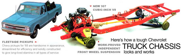 Very similar to 1967 truck. Small back window is discontinued, so all 68's will have big back windows. Side marker lamps are added to front fenders and rear bedsides. Some CST equipped trucks have upper side trim in addition to the lower side trim. CST's also have bright trim surrounding front grill and headlamp area. Letters on GMC's are now moved from grill to front of hood. First year for the optional 307 ci. & 396 ci. engines.